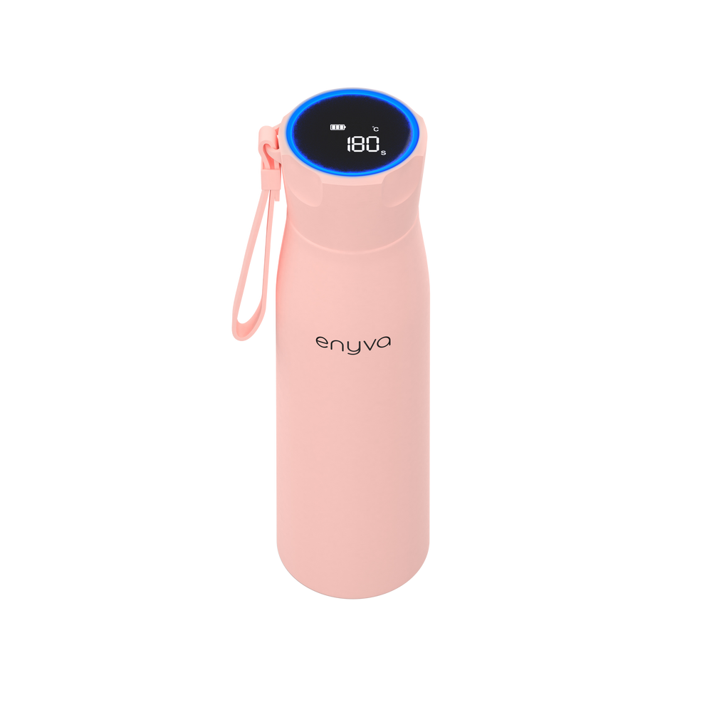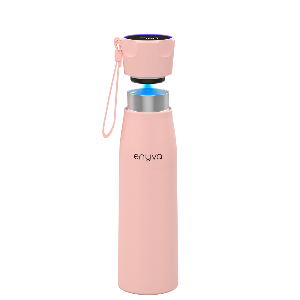 Die enyva Trinkflasche nutzt eine integrierte UV-C-LED mit 275 nm. In einem automatischen Reinigungszyklus von 180 Sekunden wird das Wasser im Inneren der Flasche mit UV-C-Licht bestrahlt, wodurch bis zu 99,99 % der gängigen wasserbasierten Bakterien und Mikroorganismen deaktiviert werden. Ganz ohne Filter oder Chemie.